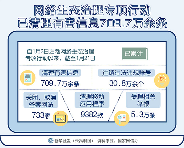 新华社北京1月23日电(记者史竞男、白瀛)记者23日从国家网信办获悉,自1月3日启动网络生态治理专项行动以来,截至1月21日,已累计清理有害信息709.7万余条,注销违法违规账号30.8万余个,关闭、取消备案网站733家,清理移动应用程序9382款,受理相关举报5.3万条。