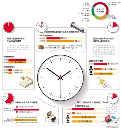 2018年,国家统计局组织开展了第二次全国时间利用调查,该调查覆盖11个省(市),采用国家统一的住户收支与生活状况调查样本框,共抽样调查20226户48580人。昨日,《2018年全国时间利用调查公报》出炉,结果显示,与2008年相比,中国居民的时间分配结构发生了较大变化,睡觉休息和用餐时间增加,收入越低的居民看电视时间越多,每天上网时间增加2小时28分钟。