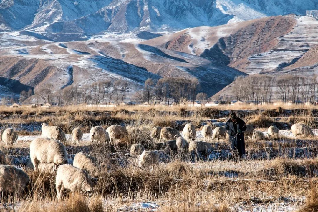 2018-12-22,甘肃省张掖市民乐县。冬日里一片苍茫,在寒风中,一个牧羊人正在守望着他的羊群。作者:清风抚柳