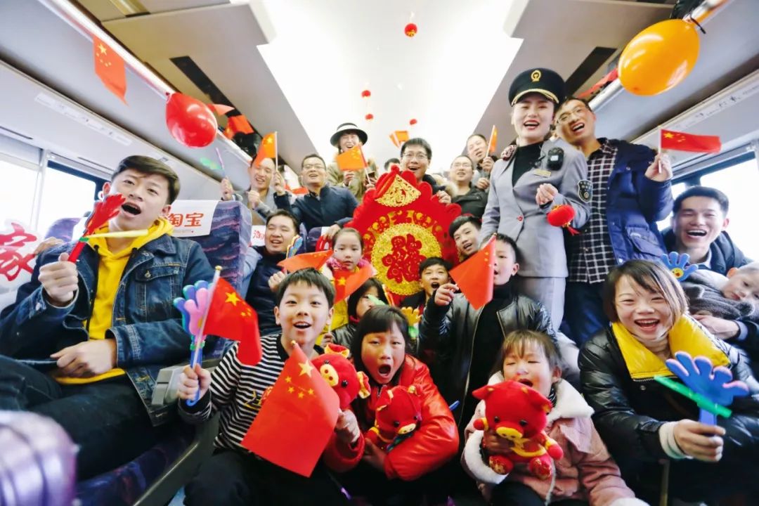 2019-02-03,江西省南昌市。D6503次列车上,列车乘务人员为了让旅客返乡旅程体验更美好,精心布置车厢,为旅客派发福袋、糖果并合影留念。作者:嗯叮