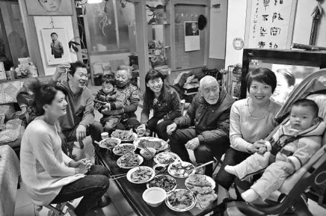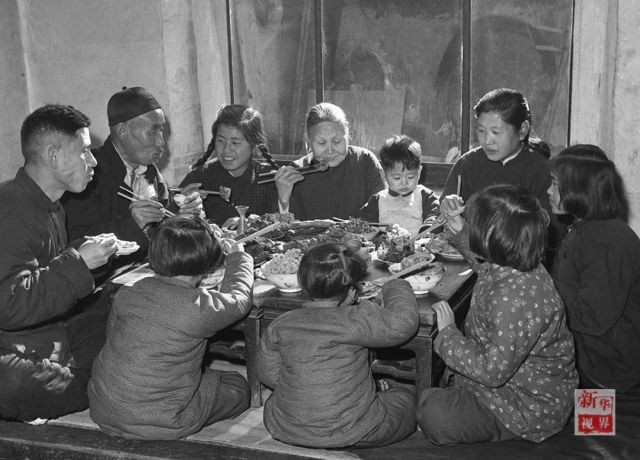 ↑1953年,天津市汉沽区芦台王德铸(左一)一家吃团圆饭。