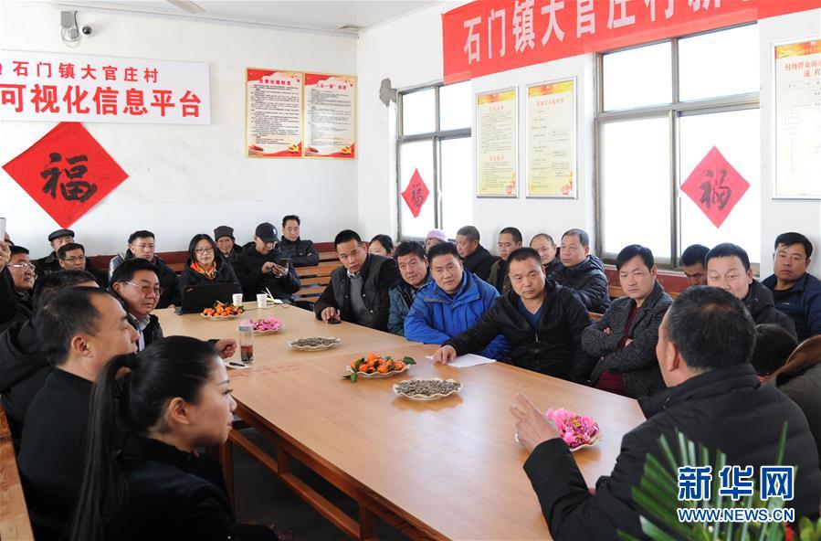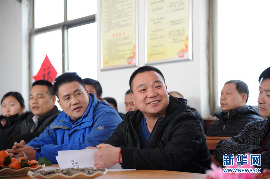 在临沭县大官庄村村民茶话会现场,归乡人员和村干部共同探讨未来致富发展思路(2月7日摄)。新华社记者 袁军宝 摄