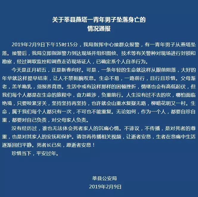 2月9日,山东莘县公安局通过官方微信,通报了“莘县燕塔一青年男子坠落身亡”事件。