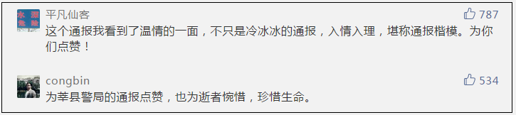 撰写这份通报的莘县公安局宣传科室相关负责人称,通报发布后,他们收获了很多暖心留言。“其实我们这样写通报的原因很简单,就是站在死者家属的角度、立场去考虑这个事情。”