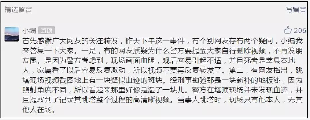 “我们就在通报的基础上,通过留言进行了辟谣和提醒。”警方表示,就此事有个别网友存有两个疑问:一是,质疑为什么警方要提醒大家自行删除视频。警方解释,现场画面血腥,观后容易引起不适,并且死者是莘县本地人,家属看了以后容易反复激动。二是,网友指出,跳塔现场视频截图地上有一块疑似血迹的斑块。经刑事勘验那是一块新补的地板漆,因照射角度不同,所以看起来那里好像是湿了一块儿。警方在现场并未发现血迹,此外,当事人跳塔时,现场只有他本人。