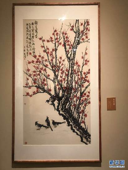 展览中的画作可谓是百花齐放,可真真让笔者印象深刻的当属“梅立寒香图”了。铁枝繁花,雄浑厚重,红梅怒放,充满春意生机。此幅寒梅老干新枝,昂扬向上,豪放不羁,尽显梅花的冷香傲骨。画作兼有书法笔意,运笔意味隽永,挺劲潇洒,自上而下,一气呵成。红梅枝繁花茂,但繁而不乱,疏密有绪,错落有致,圈花点蕊,别开生面。三只喜鹊,堪称此画点睛之笔。在中国传统习俗上,喜鹊被认为是一种报喜的吉祥鸟,“抬头见喜”,寓意喜事的到来。