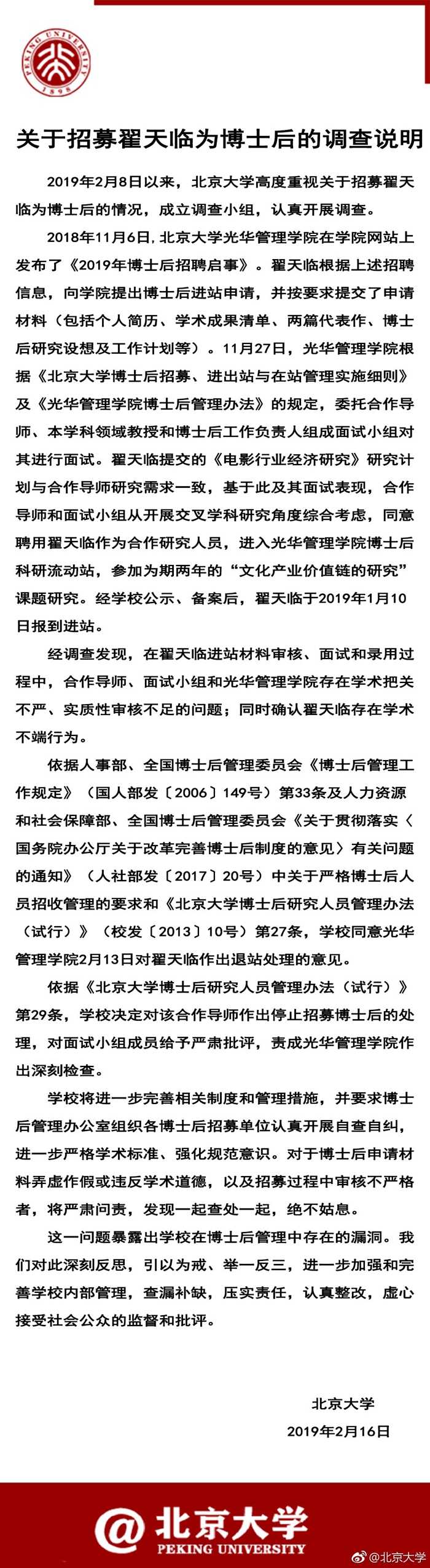 2月16日北京大学官方微博发布关于招募翟天临为博士后的调查说明。