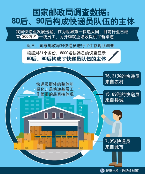 近日,国家邮政局对快递员进行了生存现状调查,根据对31个省份、6000名快递员的调查显示,80后、90后构成了快递员队伍的主体。快递员群体的整体年轻化,是快递基层工作繁重的最直接体现。76.31%的快递员来自农村,15.89%的快递员来自县城,仅有7.8%来自城市。