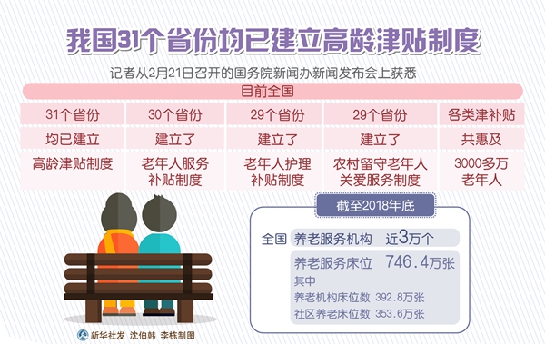 新华社北京2月21日电(记者罗争光)记者从21日召开的国务院新闻办新闻发布会上获悉,目前全国31个省份均已建立高龄津贴制度。与此同时,有30个省份建立了老年人服务补贴制度,29个省份建立了老年人护理补贴制度,29个省份建立了农村留守老年人关爱服务制度,各类津补贴共惠及3000多万老年人。