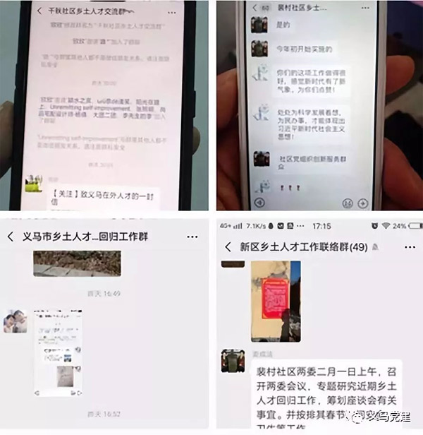 为了方便开展工作,加强日常联系沟通,市级层面,组织部牵头建立各办事处党工委书记、副书记、专职党务干部微信工作群,办事处建立各社区党组织书记微信群,社区建立外出人员微信群,及时推送家乡情况和工作动态,掌握工作进度。