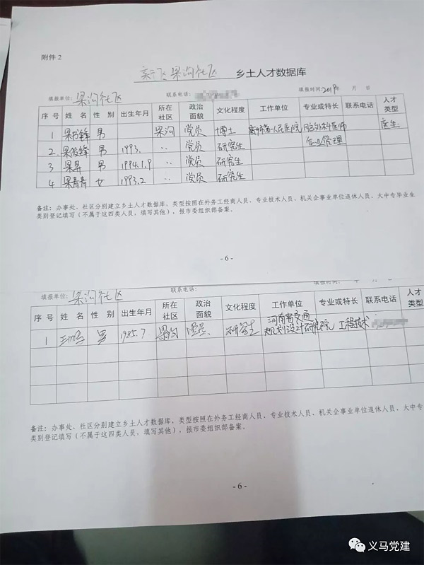 由办事处党工委负责,重点对本辖区外出务工经商人员、专业技术人员、机关企事业单位离退休人员、大中专毕业生等群体中的乡土人才进行摸排统计,摸清乡土人才联系电话、住址、单位、家庭等情况,春节期间登记外出人员信息330条。