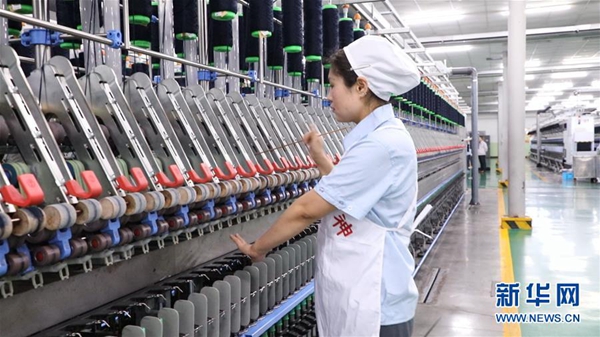 2月18日,在兰州三毛实业股份有限公司纺纱厂,范冬云在进行“接线”操作。新华社发(张智敏 摄)