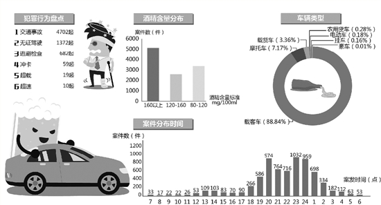 有11315起案件涉及醉驾。酒精含量160mg/100ml以上的居然有5088起案件。