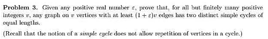 让中国队全军覆没的第3题,翻译过来的大致意思是:给定任何一个正实数e,证明除了有限个正整数以外的所有正整数v,任何有v个顶点并且有大于等于 (1+e)v条边的图至少包含两个不同的等长简单回路。