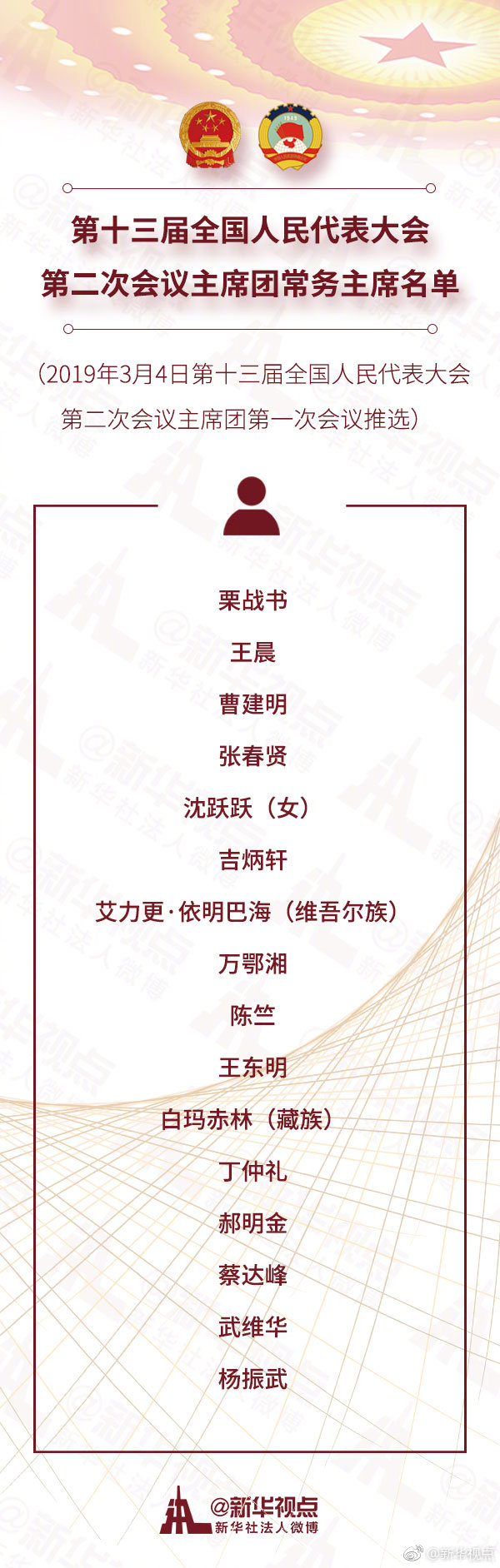 第十三届全国人民代表大会第二次会议主席团常务主席名单