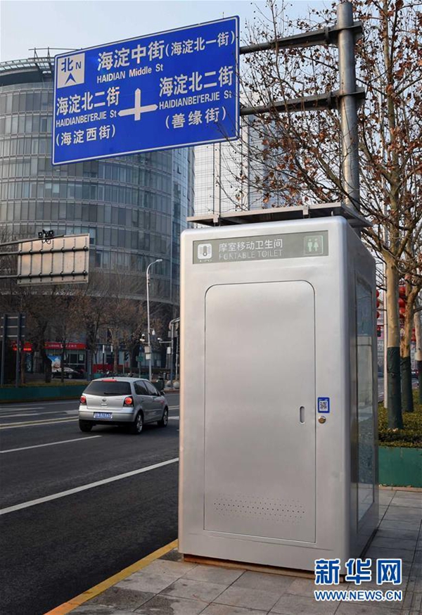 这是摆放在海淀区中关村西区的智能移动厕所(2月19日摄)。 新华社发(任超 摄)