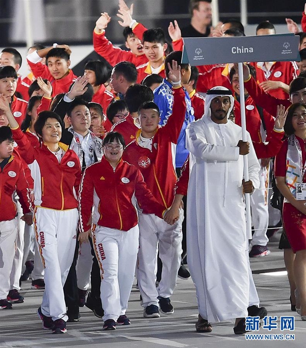 图为3月14日,李想(中)与自己的偶像、前奥运冠军李小鹏(前排右五)随中国代表团在2019年阿布扎比夏季特奥会开幕式上入场。 新华社记者 夏一方 摄