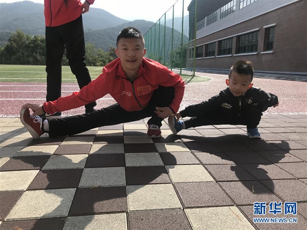 图为李想(左)与弟弟一起做拉伸。(李想的母亲杨建英提供的资料照片) 新华社发