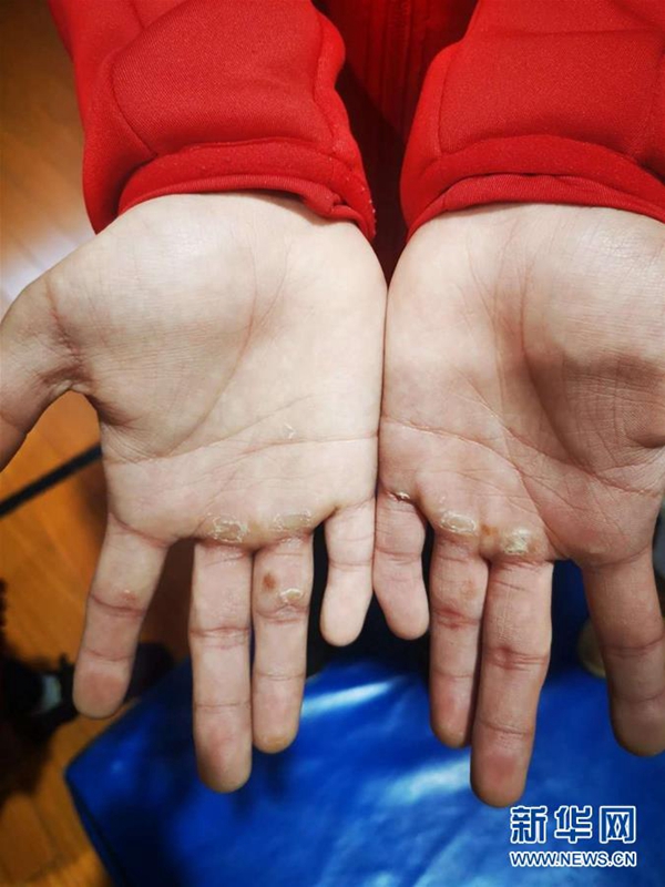 图为李想展示手上的老茧。(李想的母亲杨建英提供的资料照片) 新华社发