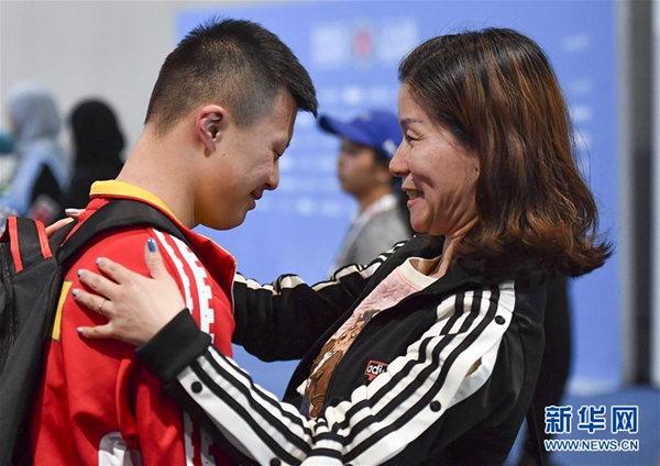 图为3月13日,李想(左)在比赛后与母亲杨建英在一起。 新华社记者 夏一方 摄
