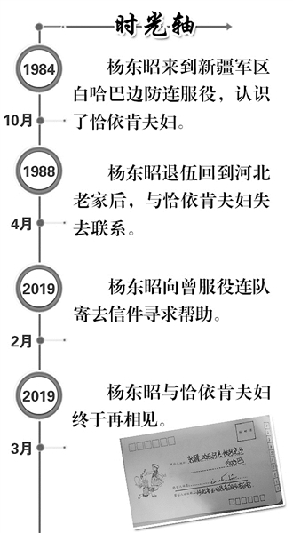 随着时间的推移,杨东昭这个当年20岁的小伙子如今已年过半百,虽然日子过得越来越红火,但内心对两位哈萨克族老人的思念越发强烈。在千家万户团聚欢乐的鞭炮声中,他提笔写了一封信寄到曾经服役的连队寻求帮助。