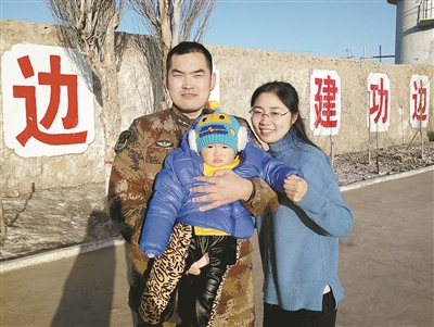 副连长张琳一家三口则在营区两棵象征扎根边疆的大树下拍下了“全家福”(图三,殷鹏钊摄)
