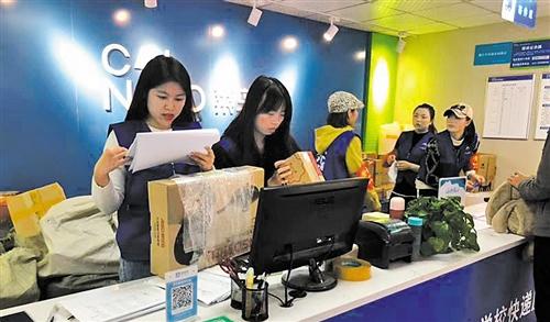 左图 四川外国语大学综合物流服务中心内,工作人员精准记录着快递末端的流通信息。