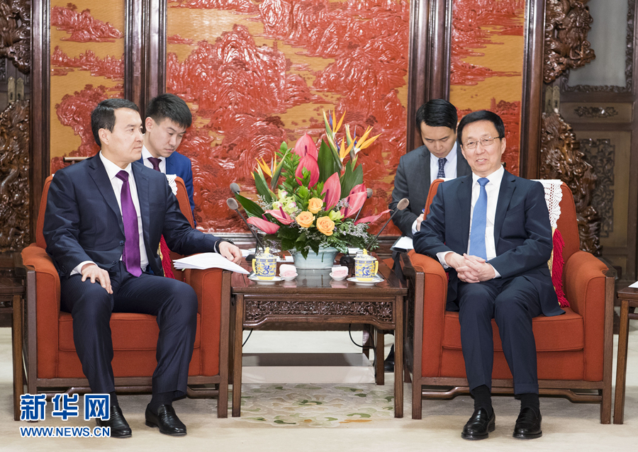 韩正表示,中哈是友好邻邦和全面战略伙伴。在习近平主席和纳扎尔巴耶夫总统的战略引领和亲自推动下,中哈关系保持高水平运行,已成为国与国之间和睦相处、互利共赢的典范。双方高层交往密切,政治互信不断增强,共建“一带一路”成果丰硕。希望双方进一步发挥好中哈合作委员会重要作用,加强发展战略对接,推进经贸、投资、海关、金融等领域务实合作,支持两国企业按商业化市场化原则加强项目合作,推动中哈合作不断取得新进展。