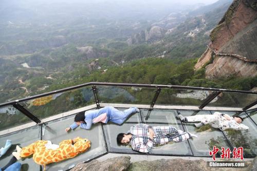 资料图:2017年3月21日,正值世界睡眠日,游人身着卡通睡衣躺在湖南平江石牛寨的悬崖玻璃栈道上,摆出各种睡姿享受睡眠,以此行为艺术呼吁关注睡眠健康。 杨华峰 摄