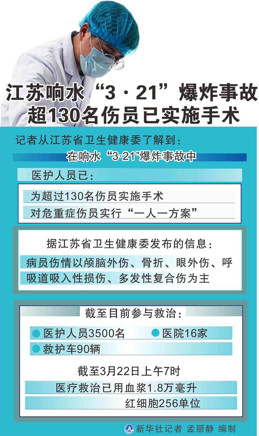 新华社南京3月22日电(记者朱国亮、邱冰清)记者从江苏省卫生健康委了解到,在响水“3·21”爆炸事故中,医护人员已为超过130名伤员实施手术,对危重症伤员实行“一人一方案”,进行针对性治疗。