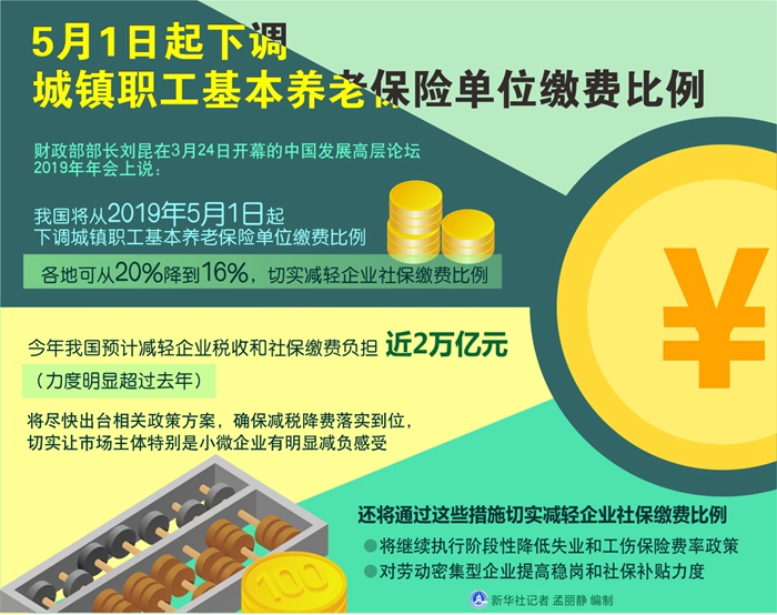 新华社北京3月24日电(记者韩洁、马卓言)财政部部长刘昆在24日开幕的中国发展高层论坛2019年年会上说,我国将从2019年5月1日起下调城镇职工基本养老保险单位缴费比例,各地可从20%降到16%,切实减轻企业社保缴费比例。