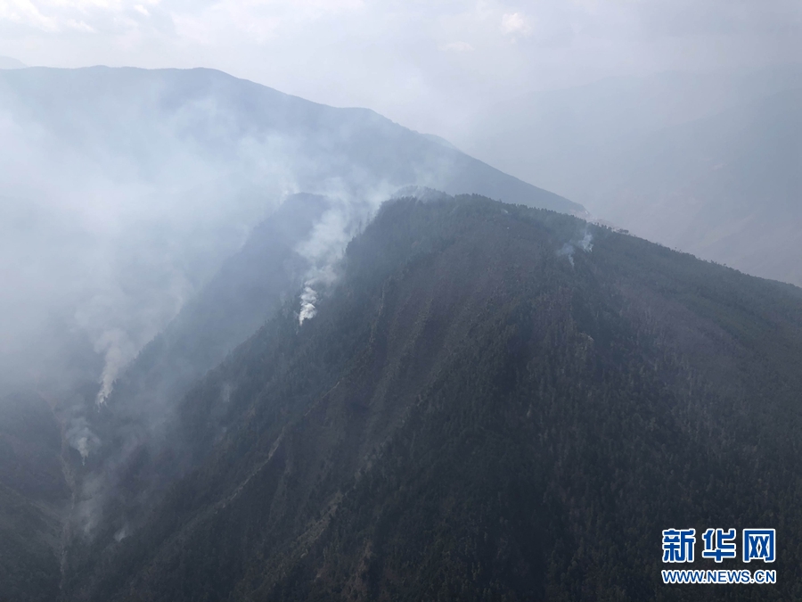 俯瞰四川省凉山州木里县雅砻江镇火场火点(4月1日摄)。 新华社发(林继平 摄)