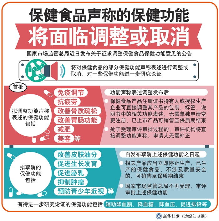 新华社北京4月2日电(记者赵文君)为进一步加强保健食品保健功能声称管理,国家市场监管总局近日发布关于征求调整保健食品保健功能意见的公告,将对保健食品的部分保健功能声称表述进行调整或取消,对一些保健功能进一步研究论证。
