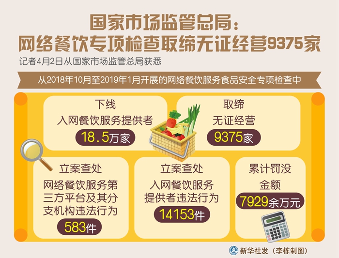 新华社北京4月2日电(记者赵文君)记者2日从国家市场监管总局获悉,在近期开展的网络餐饮服务食品安全专项检查中,下线入网餐饮服务提供者18.5万家,取缔无证经营9375家。