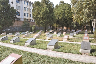 笔者采访的那天下午,陵园附近岳庙中学的两位高三女学生,背着书包走进了陵园。两位女学生用手轻轻抚去墓碑上的尘土,在每一座烈士墓碑前低头默哀……