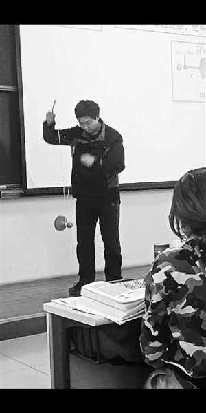 北理工副教授石宏霆在课上用抖空竹、打乒乓球的方式讲解物理学原理。