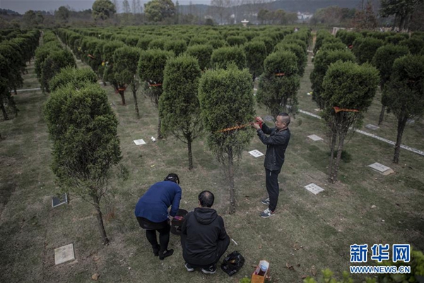 人们在树葬的墓穴前悼念故人。新华社记者 肖艺九 摄