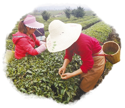 正值初春,茶海一股股绿色波浪间,采摘明前茶的身影渐渐多起来。走近些,只见茶农两手并用,上下翻腾,大拇指和食指准确地将茶青捏住,用力一提,手腕一甩,鲜嫩的芽便收入了斜挎背的竹篓里。切不可用指甲掐,否则破坏了细胞结构,茶青是要变黑的。