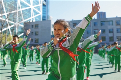 新京报记者走访北京中小学发现,动感活泼的音乐和流行的动作更能激发同学的锻炼热情,尤其是那些跳惯了传统广播体操的高年级学生。为此,北京一些学校通过自编操提升学生兴趣,武术、跳绳等动作和流行音乐也融入了课间操中。