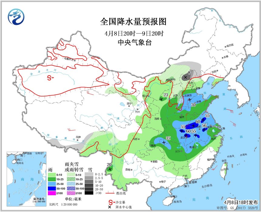 张涛:降水的主要影响时间为8日夜间到9日白天。北方地区以大范围小到中雨的稳定性降水为主,无雷电,影响区域主要集中在西北地区东部、内蒙古中部、华北、黄淮等地。河北南部、河南北部、山东西部等地会达到大雨量级。除此之外,北方部分地区降水会经过雨转雨夹雪或雪的过程,转化主要位置在山西北部、河南北部、北京北部等,内蒙古中部局部地区会出现大雪天气。南方的降水量相对较大,以中到大雨为主,部分地区有暴雨,江汉、黄淮南部、江淮、江南等区域会伴有雷电。河南南部和西部、安徽中北部、江苏中北部和南部、湖北北部和南部、湖南西部等地的部分地区将有短时强降水天气;河南南部、安徽中北部、湖北北部和东部等地的局地将有雷暴大风或冰雹天气。