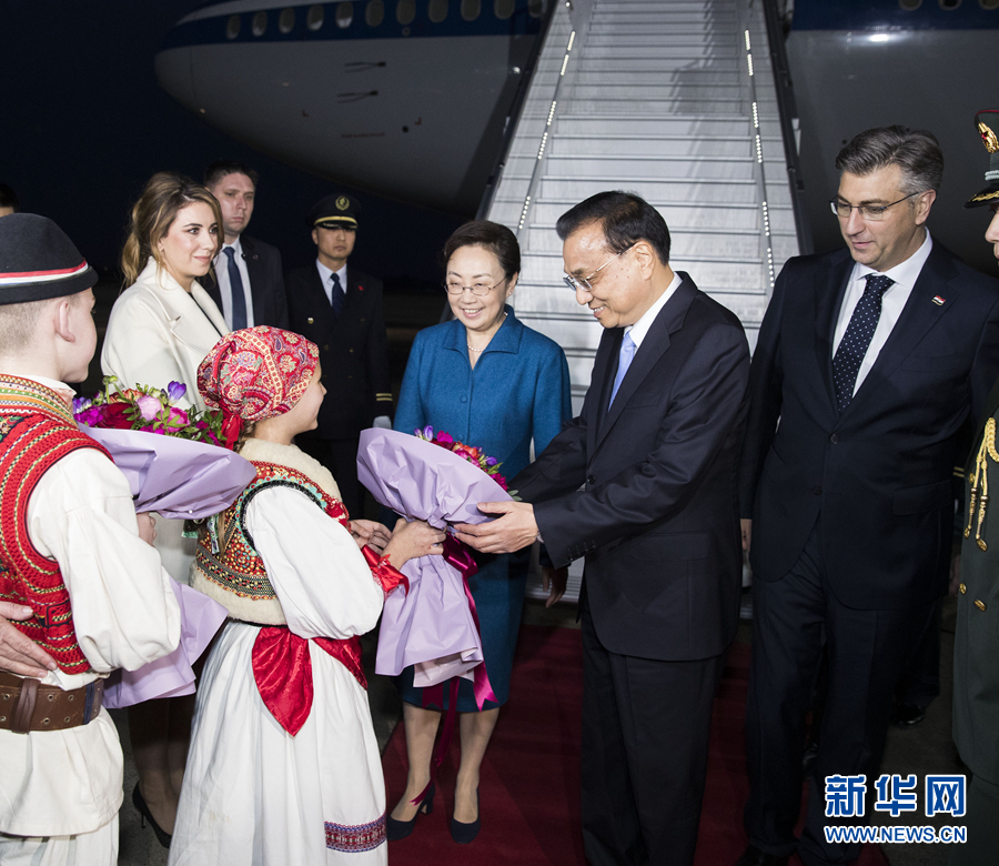 克罗地亚总理普连科维奇和夫人安娜·普连科维奇以及克罗地亚政府高级官员在舷梯旁热情迎候。礼兵沿红地毯两侧列队致敬。身着民族服装的当地儿童向李克强和程虹献上鲜花。中国驻克罗地亚大使胡兆明等也到机场迎接。