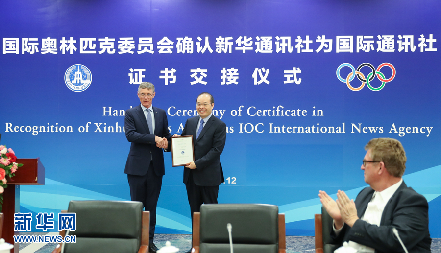 这是新华社副社长严文斌(左二)接受国际奥委会新闻委员会主席、媒体运行部总监安东尼·埃德加递交的证书。新华社记者 曹灿 摄