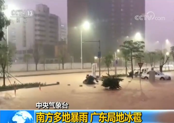 中央气象台监测显示,昨天广东、广西、福建、江西、湖南等地部分地区出现暴雨或大暴雨;广东中部和珠江口附近还伴有8~10级雷暴大风,局地出现冰雹。
