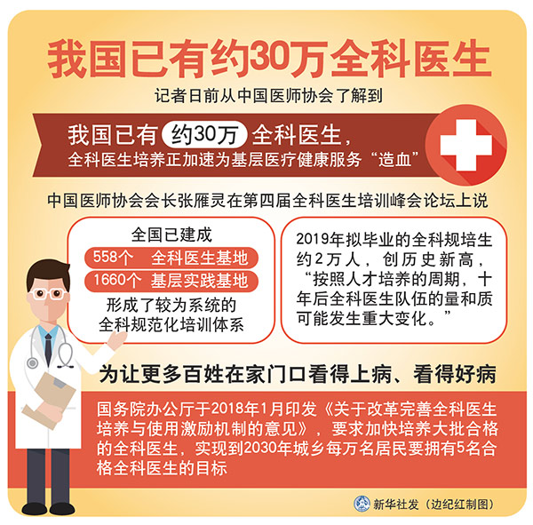 新华社北京4月19日电(记者屈婷、陈聪)记者日前从中国医师协会了解到,我国已有约30万全科医生,全科医生培养正加速为基层医疗健康服务“造血”。