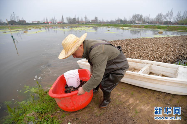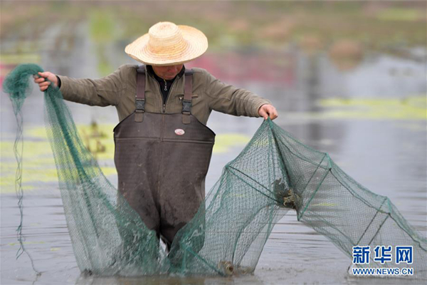 在湖南省南县一处稻虾蟹综合种养基地,农户在捕收虾蟹(3月13日摄)。新华社发(陈泽国 摄)