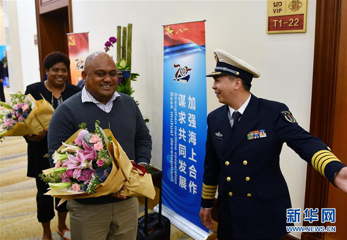 4月20日,斐济海军代表团团长、海军司令亨弗里·塔瓦基(前左)抵达山东青岛。新华社记者 朱峥 摄
