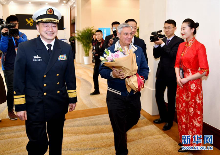 4月20日,阿根廷海军代表团团长、海军参谋长何塞·路易斯·比利安(前右)抵达山东青岛。新华社记者 朱峥 摄