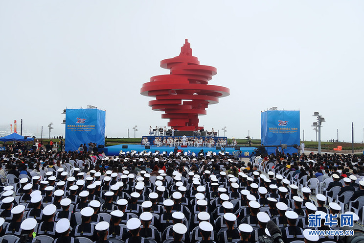 新华社青岛4月22日电(记者梅常伟)庆祝人民海军成立70周年中外海军联合军乐展示,22日下午在青岛五四广场举行。