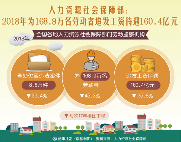 新华社北京4月23日电(记者 叶昊鸣)记者23日从人力资源社会保障部了解到,2018年全国各地人力资源社会保障部门劳动监察机构查处欠薪违法案件8.6万件,为168.9万名劳动者追发工资待遇160.4亿元。与2017年相比,分别下降39.4%、45.3%和35.8%。
