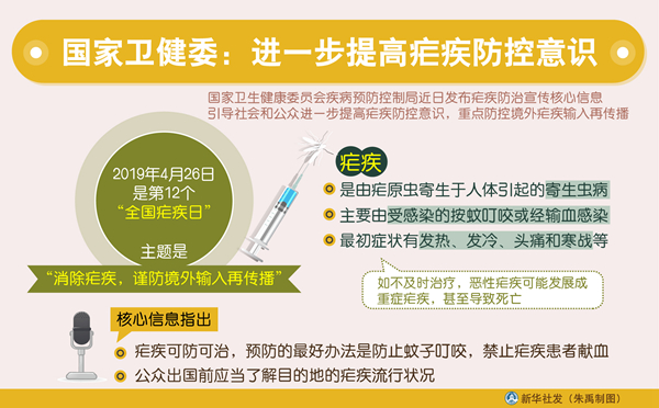 新华社北京4月25日电(记者田晓航)今年4月26日是第12个“全国疟疾日”,主题是“消除疟疾,谨防境外输入再传播”。国家卫生健康委员会疾病预防控制局近日发布疟疾防治宣传核心信息,引导社会和公众进一步提高疟疾防控意识,重点防控境外疟疾输入再传播。